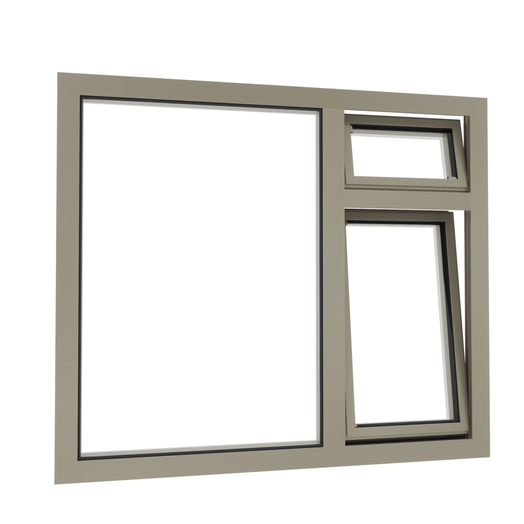 Aluminium draaikiepraam met valraam erboven en vast glasvak ernaast