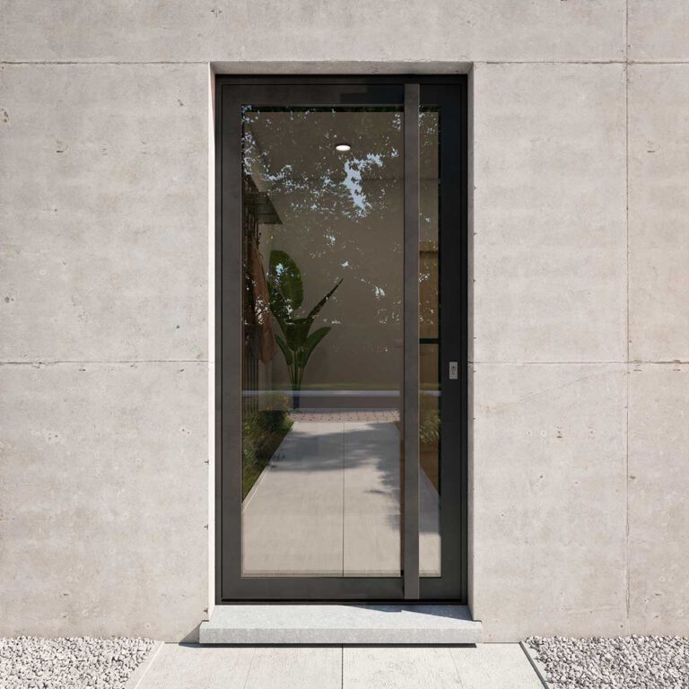 Dit aluminium deurprofiel combineert naadloos met glas en gelakte alu-sandwichpanelen. Personalisatie naargelang uw voorkeur in freeslijnen, glaspartijen en opzetprofielen is mogelijk. De vlakliggende deur is volledig compatibel met de Decalu kozijnreeks.